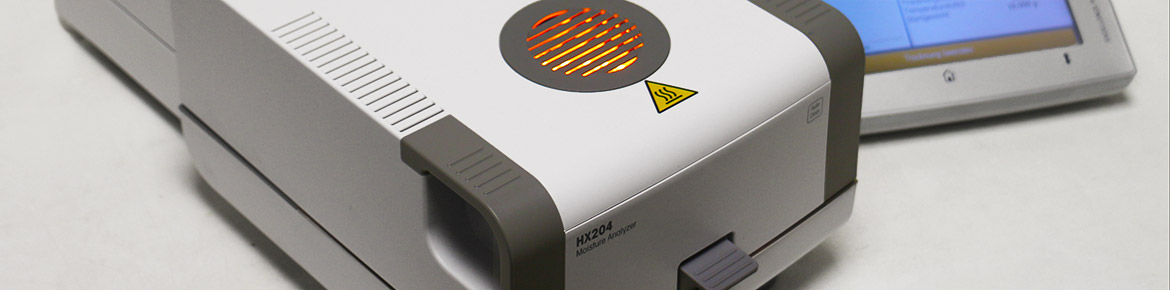 Die Thermowaage HX204 dient der Bestimmung des Feuchtigkeitsgehalts von festen Proben. Die Probe wird mit einem Halogenstrahler getrocknet und die Masseänderung über die Zeit wird aufgezeichnet. Die Massenänderung wird als abgegebene Feuchtigkeit interpretiert.