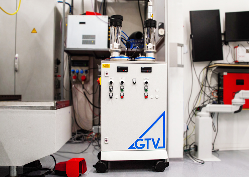 Pulverförderer mit zwei 1,5 l Pulvertöpfen zur Förderung von unterschiedlichen Materialien zum Laserauftragschweißen.