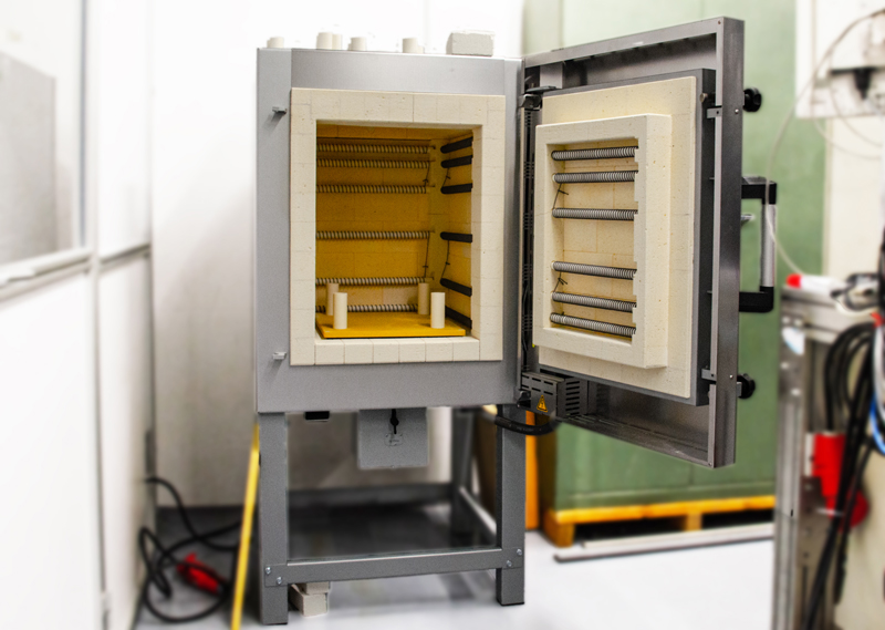 Temperofen zum Kühlen von Glasbauteilen. Bei der Bearbeitung von Glasbauteilen entstehen thermische Spannungen im Material, die mit diesem Ofen und einer angepassten Temperaturkurve eliminiert werden können.