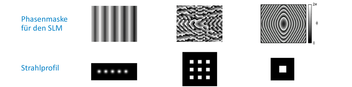In diesem Projekt ging es um die Möglichkeit, einen spatial light modulator (SLM) einzusetzen, um die heute mögliche hohe Durchschnittsleistung eines modernen Ultrakurzpuls-(UKP)-Lasers sinnvoll für die Mikromaterialbearbeitung zu nutzen. Der SLM wirkt als beugendes optisches Element in Reflexion, analog zu einem beliebig verformbaren Spiegel. Der SLM kann beispielsweise einen Laserstrahl in viele nahezu beliebig angeordnete Teilstrahlen aufspalten, das Intensitätsprofil des Laserstrahls modifizieren oder beides gleichzeitig tun. Durch diesen Ansatz ist es möglich, beispielsweise einen UKP-Laser mit einer Durchschnittsleistung von 100 W in 20 Teilstrahlen mit jeweils 5 W aufzuspalten. Dies würde dann beispielsweise das simultane Erzeugen von 20 Strukturen gleichzeitig erlauben. Zentrale Zielstellung des Projekts war die Programmierung und praktische Anwendung von Algorithmen, die es erlauben, einen SLM so anzusteuern, dass er einen UKP-Laserstrahl in beliebige Intensitätsverteilungen und Anordnungen von Teilstrahlen umwandeln kann.